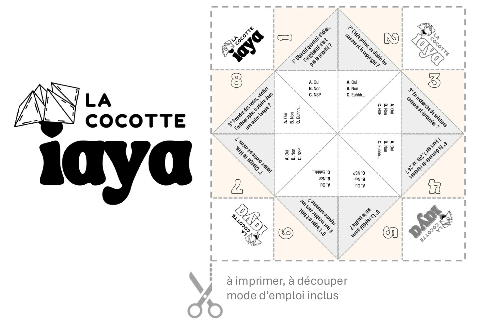 Pour y voir plus clair, j’ai imaginé la cocotte IAYA. Pensée pour vous aider à repérer si oui ou non l’usage de l’IA est pertinent pour stimuler votre créativité, elle pose 8 questions et propose 3 réponses.