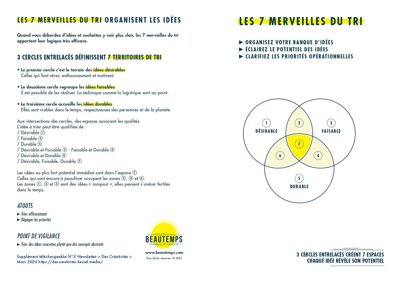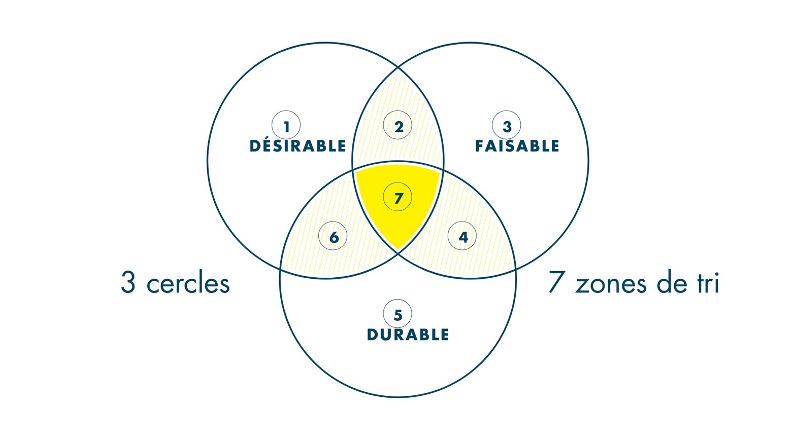 Le croisement de ces critères crée 7 espaces de tri, allant des idées encore fragiles à celles qui réunissent les trois dimensions :